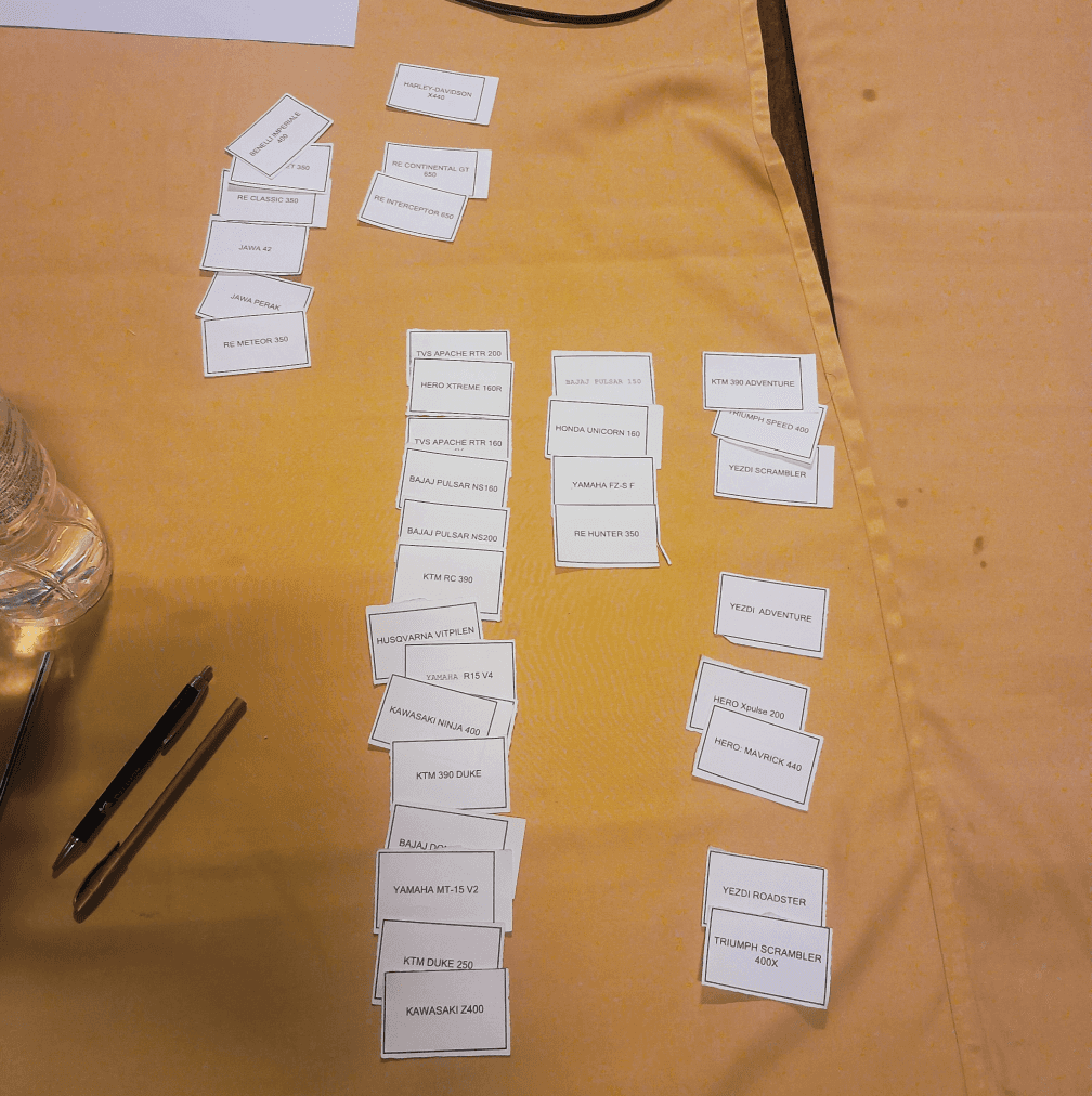 In usability-style research for Hero Maverick, we showed the prototype to Royal Enfield owners and probed what they think, feel, say, and do while interacting with it — uncovering perception gaps and opportunity areas.